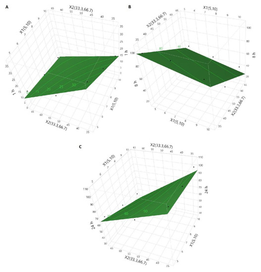 Statistically significant (p < 0.05) effects of X1 on Y1 and X2 on Y1, Y2, and Y3 were observed. The independent variables had a negative influence over Y1, Y2, and Y3 (Figure 5).