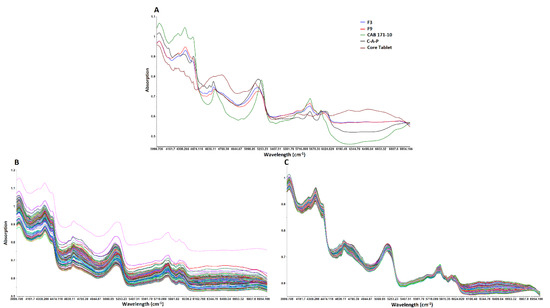 NIR spectra of the coating formulation component, core, and coated tablets are shown in Figure 7A. NIR spectra of core tablet was different from polymers used in the blend. C-A-P showed major peaks at 4142, 4435, 4624, 4670, 5203, and 5820 cm−1. CAB 171-10 showed distinct peaks at 4331, 4427, 4690, 5241, 5816, and 5943 cm−1. The coated tablets showed the peaks of both polymers. The intensity and characteristics of peaks change as the composition of coating formulation changes. With an increase in CAB 171-10 polymer in the coating composition, the spectra incorporated more features of CAB 171-10 than C-A-P. It was also characterized by changes in slope and intercept of the spectra (Figure 7A). These spectral changes can be linked to the coating composition and dissolution responses to build chemometric prediction models.