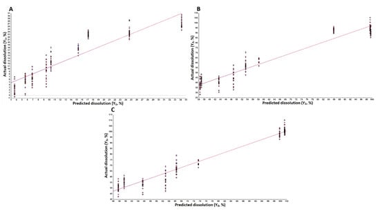 Actual and model predicted curve of (A) Y1, (B) Y2, and (C) Y3 tablets coated with CAB 171-15/C-A-P blend.
