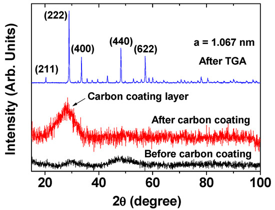 Before carbon coating, the DYO nanoparticles displayed a broad and amorphous X-ray diffraction (XRD) pattern due to their incomplete crystallization arising from their ultrasmall nanoparticle size [29] (bottom pattern in Figure 2). Here, the DYO nanoparticle is assigned as DyxOy because its structure is unknown (i.e., amorphous). The DYO@C nanoparticles showed an additional broad peak at 2θ = 20–33° (centered at 28°) arising from the carbon-coating layer, likely corresponding to the C (002) peak of amorphous carbon [30,31] (middle pattern in Figure 2). After a thermogravimetric analysis (TGA) up to 900 ℃ of the powder sample, however, only the sharp peaks of cubic Dy2O3 appeared due to the crystallization accompanying crystal growth and the combustion removal of the carbon-coating layer (top pattern in Figure 2). The estimated cell constant (10.67 Å) of the Dy2O3 nanoparticles obtained after TGA was consistent with the reported value of 10.670 Å [32].