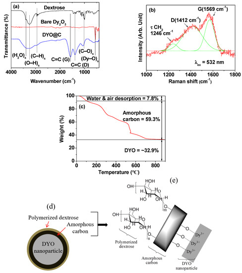 (a) FT-IR absorption spectra of the free dextrose (top spectrum), bare Dy2O3 nanoparticles (middle spectrum obtained after TGA), and DYO@C nanoparticles (bottom spectrum); (b) Raman spectrum of the DYO@C nanoparticles (excitation laser wavelength, λex = 532 nm); (c) TGA curve of the DYO@C nanoparticles; proposed (d) carbon-coating structure of the DYO@C nanoparticles and (e) carbon-coating layer structure.