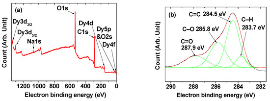 The XPS spectrum showed C, O, Na, and Dy in the nanoparticle sample (Figure 4a). Here, Na resulted from NaOH used in the synthesis and came from charge balance of the DYO@C nanoparticles with negative zeta potential. In addition, the XPS spectrum indicated the presence of various carbons such as C–H (from polymerized dextrose), C=C (from amorphous carbon), C–O (from polymerized dextrose), and C=O (from amorphous carbon; Figure 4b), supporting the presence of amorphous carbon and polymerized dextrose in the carbon-coating layer. The observed electron binding energies (EBEs) of all elements are provided in Table 2 and consistent with literature values [39,40,41,42].