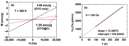 For paramagnetic materials, the Curie–Weiss law (i.e., χ = M/H = C/(T–Tc) in which χ is the magnetic susceptibility, C is the Curie constant, and Tc is the Curie temperature) can be applied [46]. As shown in Figure 5b, a linear plot was obtained, confirming the paramagnetism of the core DYO nanoparticles. From the plot, C = 0.08074 emuK/gOe was estimated, which is a small value because the core DYO nanoparticles are paramagnetic.