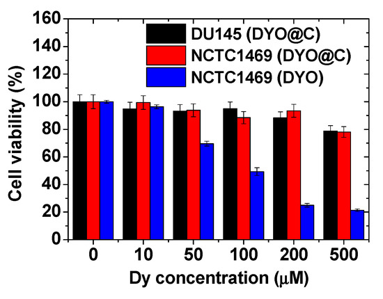 As shown in Figure 6, the cell viabilities of human prostate cancer (DU145) and normal mouse hepatocyte (NCTC1469) cells treated with the aqueous solution sample were good (>80%) up to 500 μM Dy, supporting good biocompatibility of the DYO@C nanoparticles. However, the DYO nanoparticles before carbon coating exhibited high cellular toxicities at Dy-concentration greater than 50 μM Dy, confirming the necessity of carbon coating on the DYO nanoparticle surface for biomedical applications.