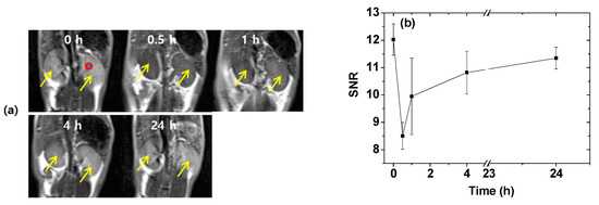 The application of DYO@C nanoparticles as an efficient T2 MRI contrast agent was demonstrated from in vivo T2 MR images of mice. Negative (i.e., darkened) contrast enhancements in the kidneys were clearly observed after intravenous administration of the aqueous nanoparticle suspension sample into mice tails (Figure 8a). The negative contrasts weakened with time (i.e., the signal-to-noise ratio (SNR) increased with time) and returned to the original contrast. To quantitatively measure the time evolution of the contrast changes, the SNR of a region-of-interest (ROI) as indicated by a small circle in the preadministration MR image (labeled as 0 h), was plotted as a function of time (Figure 8b). The plot showed that the negative contrast enhancements reached a maximum (or a minimum SNR) at 30 min after administration and then, decreased thereafter (or the SNR increased thereafter), finally reaching the initial preadministration value. However, in the liver, no noticeable negative contrast enhancements were observed at the same points after administration. This is likely because of the rapid excretion of the DYO@C nanoparticles from the liver within 30 min after administration. The SNR behavior in the kidneys was somewhat similar to that of the commercial molecular contrast agents [13,14]; this behavior is attributed to the renal excretion of the nanoparticles as observed for various ultrasmall nanoparticles in previous studies [47,48,49]. The observed appreciable negative contrast enhancement even at an appreciable (but not high) r2 value was due to a negligible r1 value (i.e., a very large r2/r1 ratio). The results prove that the DYO@C nanoparticles should function as an efficient T2 MRI contrast agent.