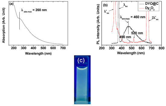 The amorphous carbon absorbs and emits visible photons because of the presence of conjugated C=C bonds [24,25]. These were confirmed from the absorption band at λabs-max = 260 nm in the UV-visible absorption spectrum (Figure 9a) and the emission band at λem-max = 460 nm in the photoluminescent (PL) spectrum (excitation wavelength, λex = 370 nm; Figure 9b) of an aqueous solution sample, as observed in the amorphous carbon nanoparticle solution sample [24]. A PL spectrum (λex = 330 nm) of the aqueous Dy2O3 nanoparticle solution sample, which was prepared by dispersing TGA-treated Dy2O3 nanoparticles in triple-distilled water, was also taken for reference (Figure 9b), showing weak Dy-transitions at 490 nm (4F9/2 → 6H15/2) and 520 nm (4I15/2 → 6H13/2) [50,51]. Therefore, most of the PL in the DYO@C nanoparticle sample solution was due to the amorphous carbon-coating layer. Here, the emission peak at 520 nm was assigned based on energetic consideration between electronic energy levels [51] below the λex = 330 nm. The quantum yield (QY) of the DYO@C nanoparticle solution sample was estimated to be 6.5% using fluorescein with a QY value of 95% as the reference [24]. This estimated value was consistent with that of amorphous carbon nanoparticle solution sample [24]. Under 365-nm UV irradiation, the aqueous nanoparticle suspension sample exhibited blue-green fluorescence (Figure 9c), corresponding to the emission range observed in the PL spectrum. The fluorescence in the visible region will be useful for fluorescence imaging, which was confirmed by cell imaging using carbon nanoparticles in previous studies [25].