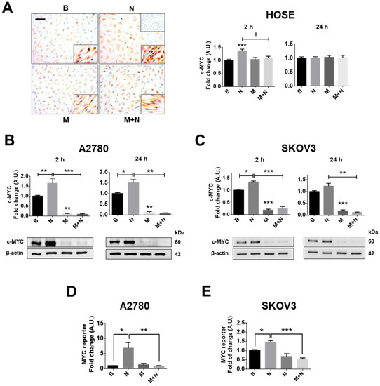 Metformin blocks the nerve growth factor (NGF)-mediated effects on c-MYC in ovarian cells. Ovarian cells were treated with metformin 10 mM for 48 h and/or NGF 100 ng/mL or 150 ng/mL (A2780/human ovarian surface epithelial HOSE cells and SKOV3 cells, respectively) for 24 h or the last 2 h. (A) Representative Images of c-MYC immunodetection in HOSE cells with semi-quantification analysis. Bar = 100 µm. Lower right inserts: 400× magnification. Upper right insert: negative control (cells without primary antibody). N = 4 independent experiments (8 images were evaluated per experiment). (B,C) Western blots of c-MYC in A2780 and SKOV3 cells. (D,E) Gen-reporter assays to evaluate MYC transcriptional activity in the epithelial ovarian cancer (EOC) cells A2780 and SKOV3. N = 4 independent experiments. * p < 0.05; ** p < 0.01 and *** p < 0.001. Statistical analysis: Kruskal–Wallis test and Dunn’s post-test. B: basal condition (without stimuli), N: NGF, M: metformin treatment. Results are expressed as the mean ± standard error of the mean (SEM).