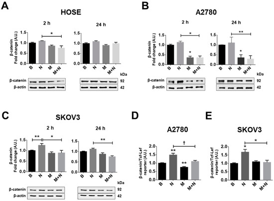 Metformin decreases the NGF-induced β-catenin/TCF-Lef transcriptional activity in EOC cells. Ovarian cells were treated with metformin 10 mM for 48 h and/or NGF 100 ng/mL or 150 ng/mL (A2780/HOSE cells and SKOV3 cells, respectively) for 24 h or the last 2 h. (A–C) Western blots of β-catenin in HOSE, A2780 and SKOV3 cells after the respective treatments. (D,E) Gene reporter assays to evaluate β-catenin/TCF-Lef transcriptional activity in the EOC cells A2780 and SKOV3. N = 4 independent experiments. * p < 0.05 and ** p < 0.01. Statistical analysis: Kruskal–Wallis test and Dunn’s post-test. † p < 0.05 as indicated according Mann–Whitney test. B: basal condition (without stimuli), N: NGF, M: metformin treatment. Results are expressed as the mean ± standard error of the mean (SEM).