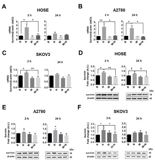 Metformin decreases the NGF-dependent increase in survivin expression in ovarian cells. Ovarian cells were treated with metformin 10 mM for 48 h and/or NGF 100 ng/mL or 150 ng/mL (A2780/HOSE cells and SKOV3 cells, respectively) for 24 h or the last 2 h. Then, survivin mRNA was detected in the ovarian cell lines HOSE, A2780 and SKOV3 by RT-PCR and protein levels were determined by Western blotting. (A–C) mRNA levels of survivin in the ovarian cell lines following metformin and NGF treatment. (D–F) Western blots of survivin in ovarian cell lines. N = 4 experiments per condition. * p < 0.05; ** p < 0.01 as indicated or with respect to basal condition. Statistical analysis: Kruskal–Wallis and Dunn´s post-test. † p < 0.05 with respect to basal condition or where indicated using the Mann–Whitney test. B: basal condition (without stimuli), N: NGF, M: metformin treatment. Results are expressed as the mean ± standard error of the mean (SEM).