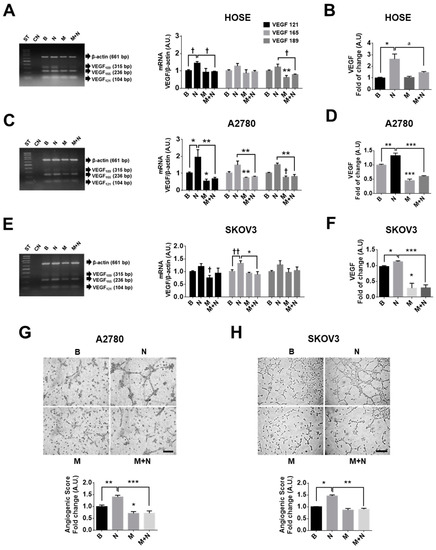 Metformin prevents the NGF induced VEGF expression and angiogenic properties of ovarian cells. Ovarian cells were treated with metformin 10 mM for 48 h and/or NGF 100 ng/mL or 150 ng/mL (A2780/HOSE cells and SKOV3 cells, respectively) for 24 h or the last 2 h, and then processed to detect VEGF expression. (A,C,E) Representative agarose gels with PCR products of different VEGF transcripts (VEGF 121, VEGF 165 and VEGF 189 amino acids) in ovarian cells. Semi-quantification of N = 4 or more independent experiments. (B,D,F) VEGF detection in the culture supernatants of ovarian cells by enzyme-linked immunosorbent assay (ELISA). N = 4 or more independent experiments induplicate. (G,H) Angiogenic score calculated as indicated in the methodology section with conditioned medium from A2780 or SKOV3 cells, respectively. Bar = 50 µm. N = 4 or more independent experiments (4–8 images were evaluated per experiment). * p < 0.05; ** p < 0.01 and *** p < 0.001 as indicated or with respect to basal conditions. Statistical analysis: Kruskal–Wallis and Dunn´s post-test. † p < 0.05 and †† p < 0.01 with respect to basal conditions or as indicated using the Mann–Whitney test. B: basal condition (without stimuli), N: NGF, M: metformin treatment. Results are expressed as the mean ± standard error of the mean (SEM).