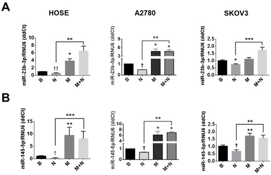 Metformin increases the expression of miR-145 and miR-23b in ovarian cell lines. Ovarian cells were treated with metformin (10 mM for 48 h) and NGF (100 or 150 ng/mL, last 3 h) to detect miR expression. miR-23b and miR-145 were quantified in HOSE, A2780 or SKOV3 cells by qPCR. N = 4 or more independent experiments in duplicate. * p < 0.05; ** p < 0.01 and *** p < 0.001 as indicated or with respect to basal conditions. Statistical analysis: Kruskal–Wallis and Dunn´s post-test. † p < 0.05 and †† p < 0.01 with respect to basal conditions or where indicated using the Mann–Whitney test. B: basal condition (without stimuli), N: NGF, M: metformin treatment. Results are expressed as the mean ± standard error of the mean (SEM).