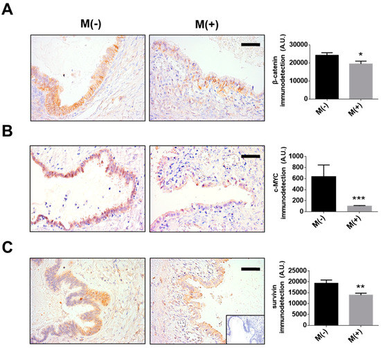 Metformin intake decreases the presence of β-catenin, c-MYC and survivin in epithelial ovarian tumours. Sequential paraffin-embedded samples from female users (M+) and non-users (M−) of metformin were used to detect oncoproteins by immunohistochemistry: β-catenin (A) c-MYC (B), or survivin (C) levels. N = 4 independent experiments (6–8 images were evaluated per experiment). Bar = 40 µm. * p < 0.05; ** p < 0.01 and *** p < 0.001 according to the Mann–Whitney test. Results are expressed as the mean ± standard error of the mean (SEM).