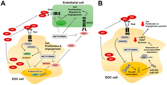 Proposed mechanisms by which metformin prevents NGF–mediated effects in EOC cells. (A) Metformin blocks the NGF-induced c-MYC, survivin and VEGF protein levels, decreasing the proliferative and angiogenic potential of EOC cells. NGF and VEGF are depicted as acting directly on endothelial cells, while c-MYC and survivin changes contribute to EOC cell proliferation and VEGF expression. (B) Metformin increases the expression of oncosuppressor miR-145 and miR-23b, which may be responsible for the observed decreases in c-MYC, survivin and VEGF levels in EOC cells. Filled arrows mean stimulation, thick perpendicular bars mean inhibition and dotted lines mean indirect association.