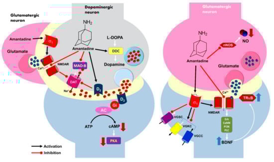 A model of the possible molecular mechanism of amantadine’s antidepressant effects at the level of dopaminergic and glutamatergic transmission. Amantadine indirectly increases the dopamine level within the synaptic cleft due to inhibition of the dopamine transporter DAT1 via the blockage of the presynaptic NMDA receptor ion channel. The activation of the presynaptic dopamine receptor D2 may also reduce DAT1 activity in response to the high neurotransmitter level and/or drug binding. D2 is a Gi-coupled receptor, and its excitation causes an inhibition of the adenylyl cyclase (AC) activity, decreased cAMP production, and finally, the silencing of the protein kinase A (PKA)-dependent neuronal signaling pathway. Activation of the σ1 receptor can additionally enhance the synaptic dopamine concentration. The σ1 receptor regulates the activity of several voltage-gated sodium, potassium, and calcium channels, G-protein coupled receptors (GPCRs), and some protein kinases. Receptor activation causes a blockade of Na+ channels (VGSC), while its interaction with K+ (VGKC) and Ca2+ (VGCC) channels may be excitatory or inhibitory. The activation of the σ1 receptor results in the enhancement of both NMDA and dopamine D1 receptors. Amantadine is able to inhibit monoaminoxidase B (MAO-B), but it does support L-DOPA decarboxylase (DCC) activity in the presynaptic neuron. The amantadine-related blockade of NMDA receptor function in the glutamatergic neurons causes an upregulation of BDNF and TrkB expression via Erk, CamK, PI3K, and PLC signalling cascade. Amantadine may also inhibit nitric oxide synthase (nNOS) activity and decrease neuronal NO level. All those neurochemical events are considered to be responsible for the generation of the antidepressant effects of amantadine. L-DOPA decarboxylase (DCC); NMDA receptor (NMDAR); phospholipase C (PLC); tyrosine receptor kinase B (TrkB); extracellular signal-regulated kinases (Erk); brain derived neurotrophic factor (BDNF); phosphoinositide 3-kinase (PI3K); calcium/calmodulin-dependent protein kinase (CamK). Up and down thick arrows indicate direction of changes, thin arrows show the course of biochemical reactions, lines with dots indicate functional connections.