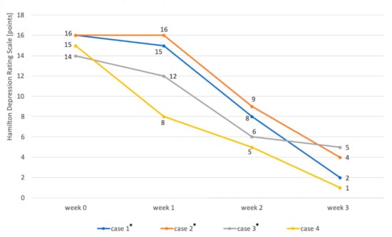 Figure 2. Changes in the severity of depression during the treatment of patients (n = 4) diagnosed with bipolar disorder in the depressive phase by adding amantadine to the mood stabilizer. The severity of depression was assessed using the HDRS scale four times—before the start of treatment (week 0), after the week (week 1), after 2 weeks (week 2), and after three weeks of treatment (week 3). The asterisks mark the patients whose dose of amantadine was increased to 200 mg/day in the second week. * the patients whose dose of amantadine was increased to 200 mg/day in the second week. - A 56-year-old Caucasian male treated for bipolar disorder since 2016, when he experienced a two-month manic episode. He then received valproic acid in a dose of 1500 mg daily and olanzapine in a dose of 20 mg in the evening. His mania symptoms resolved and he was then treated only with valproic acid. In 2017, he reported significant depression (19 points on the HDRS scale). The clinical picture was dominated by tearfulness, sadness, lack of motivation, anhedonia, lack of energy, and difficulty with concentration. He received lamotrigine at the target dose of 150 mg/day, but after 4 months the depression was still there (15 points on the HDRS scale). He then received mirtazapine in a dose of 30 mg in the evening, but after another 2 months, the symptoms remained (16 points on the HDRS scale). The patient was then offered to add amantadine at an initial dose of 100 mg in the morning to valproic acid and lamotrigine. As there was no improvement after one week, the amantadine dose was increased to 200 mg in the morning. After another week, the patient felt better (HDRS 9 points). At the visit after 3 weeks of treatment with amantadine, the patient had an HDRS score of 4 (Figure 2). He continued treatment for another 2 weeks, then lowered the dose to 100 mg in the morning, and stopped taking the drug after 3 days. There were no adverse effects of amantadine and no change from the depressive phase to the manic one, and no relapse of depression after discontinuation of amantadine.