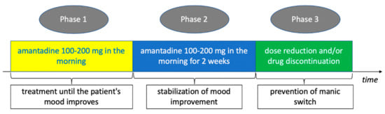 The proposed treatment of bipolar depression with amantadine. The duration of the first phase of treatment (Phase 1) depends on the time when a significant (50%) improvement in the severity of depressive symptoms occurs. Limiting the duration of use of amantadine in the second treatment period (Phase 2 and 3) is due to the minimization of the risk of a manic switch.
