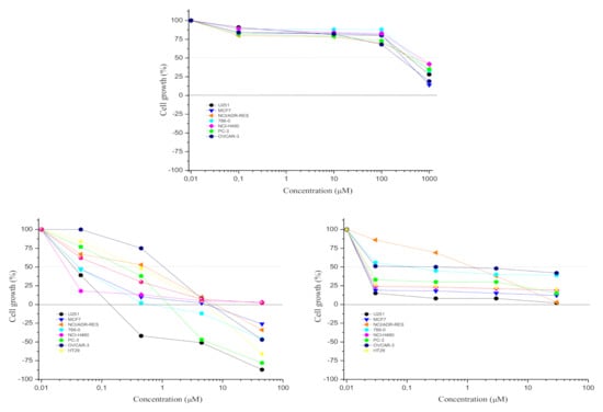 Human tumor cell lines [U251 (central nervous system, glioblastoma), MCF7 (breast, adenocarcinoma), NCI/ADR-RES (multidrug resistant ovarian adenocarcinoma), 786-0 (renal adenocarcinoma), NCI-H460 (lung, large cell carcinoma), PC-3 (prostate, adenocarcinoma), OVCAR-3 (ovarian adenocarcinoma) and HT29 (colon, adenocarcinoma)] were kindly donated by the National Cancer Institute at Frederick MA-USA. Stock cultures were grown in complete medium [RPMI 1640 medium supplemented with 5% fetal bovine serum and 1% penicillin:streptomycin mixture (1000 U∙mL−1:1000 µg·mL−1)] at 37 °C with 5% CO2.