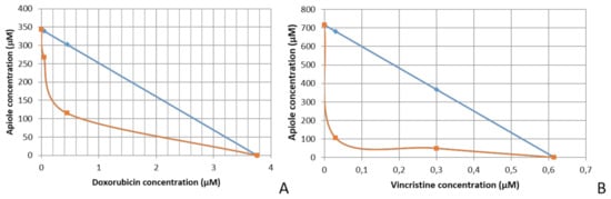 Isobolograms representing the synergistic interaction of the apiole with chemotherapeutic drugs doxorubicin (A) and vincristine (B) on NCI/ADR-RES cell line, after 48 h of incubation.