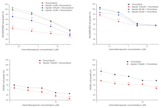 Influence of apiole on the antiproliferative profiles of the chemotherapeutic drugs doxorubicin and vincristine against human ovarian tumor cell line panel after 48 h exposure. (A) Human tumor cell line: multidrug-resistant ovarian adenocarcinoma cell line NCI/ADR-RES; Treatments: apiole (10, 100 and 1000 µM), doxorubicin (0.045–45 µM); (B) Human tumor cell line: multidrug-resistant ovarian adenocarcinoma cell line NCI/ADR-RES; Treatments: apiole (25, 50 and 100 µM), vincristine (0.03–30 µM); (C) Human tumor cell line: ovarian adenocarcinoma cell line OVCAR-3; Treatments: apiole (100 µM), doxorubicin (1.25 to 20 μM). (D) Human tumor cell line: ovarian adenocarcinoma cell line OVCAR-3; Treatments: apiole (100 µM), vincristine (1.25 to 20 μM). Statistical analysis by one-way ANOVA followed by Tukey’s test (* p < 0.05; ** p < 0.01; *** p < 0.001, related to chemotherapeutic drug alone). The experiments were carried out in triplicate.