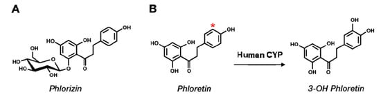 Phlorizin (phloretin 2’-O-glucose) is the major form of phloretin found in apples. Phlorizin is absorbed in the small intestine and transported via sodium–glucose transporters (SGLTs) with subsequent deglycosylation by β-glucosidase activity of lactate-phlorizin hydrolase [6,7]. Phlorizin is known to be a specific competitive inhibitor of SGLTs in intestines (SGLT-1) and kidneys (SGLT-2), and it seems to show beneficial effects on obesity and diabetes [8]. The major cytochrome P450 (P450 or CYP) enzyme involved in the metabolic reactions of flavonoids is CYP1A2, whereas other human liver P450s (such as CYP3A4, CYP2D6, CYP2E1, CYP2C19, and CYP2E1) contributed as minor roles to flavonoid metabolism when the metabolisms of 30 flavonoid aglycones were screened using human liver P450 enzymes [9]. The main oxidation reaction is hydroxylation at the carbon in the phenyl ring. However, the metabolic pathway of phloretin in humans has not been reported.