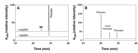 Human liver microsomal reactions included incubation at 37 °C in 0.25-mL incubation mixtures containing P450 (0.4 μM) in a potassium phosphate buffer (100 mM, pH 7.4), an NADPH-generating system (NGS, final concentration: 10 mM glucose-6-phosphate, 0.50 mM NADP+, and 1.0 IU yeast glucose-6-phosphate dehydrogenase per mL), and the reaction substrate (0.50 mM). Incubations were performed generally for 60 min with or without the NADPH-generating system (NGS). Phloretin and its metabolites were extracted twice with ethyl acetate, followed by centrifugation (1000× g, 20 min) to separate the organic and aqueous layers [37,38].