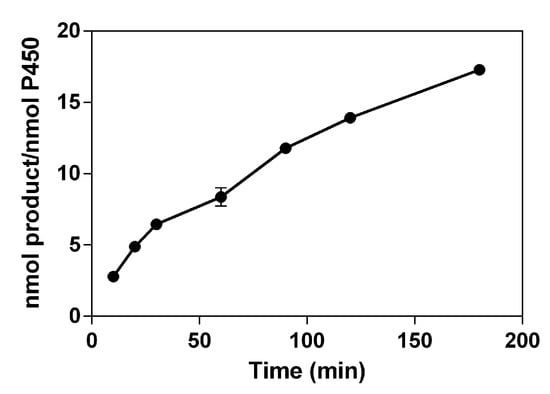 When the time profile of 3-OH phloretin formation by HLMs ranged from 10 to 180 min, the formation of 3-OH phloretin gradually increased with the reaction time. The total turnover number (TTN, nmol product/nmol enzyme) was 17.3 at 180 min into the reaction (Figure 4).