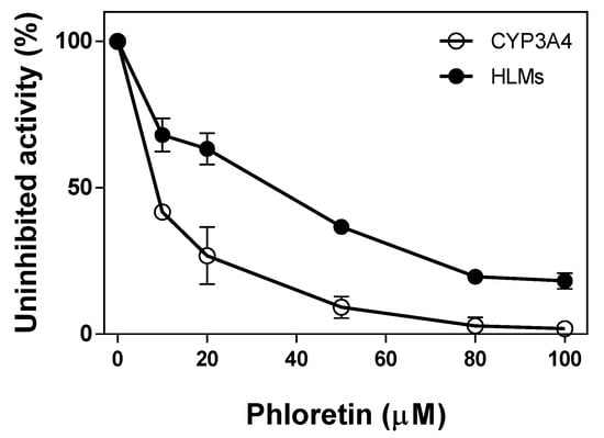 Phloretin inhibited testosterone 6β-hydroxylation catalyzed by CYP3A4 and HLMs as the concentration of phloretin increases (Figure 6). It showed a high inhibitory effect on CYP3A4-catalyzed testosterone 6β-hydroxylation. When 10 μM and 50 μM of phloretin were preincubated with CYP3A4, 40% and 91% of the CYP3A4 activity was inhibited, respectively. Phloretin’s inhibitory effect on the activity of HLMs was much lower than on CYP3A4. When 50 μM of phloretin was preincubated with HLMs, 63% of activity was inhibited. The half maximal inhibitory concentration (IC50) values of testosterone 6β-hydroxylation via phloretin against CYP3A4 and HLMs were 13 μM and 92 μM, respectively. Thus, phloretin can be a substrate of CYP3A4 with a high affinity, and other P450(s) in addition to CYP3A4 may be involved in testosterone 6β-hydroxylation in HLMs. It is known that human CYP2C9 and CYP2C19 have the catalytic activity of testosterone 6β-hydroxylation in addition to CYP3A4 [14].
