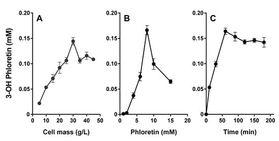 Figure 7. Whole-cell biotransformation of phloretin by a recombinant E. coli cell expressing CYP3A4. (A) Effect of cell concentration on the conversion of phloretin into 3-OH phloretin by whole cells expressing CYP3A4. The reactions were performed with cell concentrations from 5 to 45 g L−1 and 10 mM of phloretin at 37 °C for 60 min. (B) The effect of phloretin concentration on the production of 3-OH phloretin by recombinant whole cells expressing CYP3A4. The reactions were performed in a range from 1 to 15 mM with 30 g L−1 cells at 37 °C for 60 min. (C) Time courses of phloretin into 3-OH phloretin by recombinant E. coli cells expressing CYP3A4. The reactions were performed with 30 g L−1 cells and 8 mM of phloretin at 37 °C for 180 min. Data are shown as the means ± the SD of triplicate determinations.