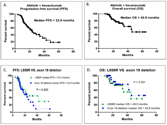 The patients were treated with afatinib at a starting dose of either 40 or 30 mg once daily until disease progression or intolerable toxicity occurred. Bevacizumab was administered intravenously with an initial dose of 15 or 7.5 mg/kg during afatinib therapy. The dose and schedule of afatinib and bevacizumab were adjusted by the physicians depending on the patient’s clinical condition and toxicity from treatment. Response Evaluation Criteria in Solid Tumors version 1.1 was used for the assessment of treatment responses, defined as PD, SD, and PR. PFS was defined as the duration from the first date of afatinib administrated until the date of the first imaging evidence of disease progression, death, or last follow-up. OS was defined as the duration from the date of diagnosis until the date of recorded mortality. If patients were still alive on 31 July 2020 (the last follow-up time point), the survival was censored at the last visit date recorded.