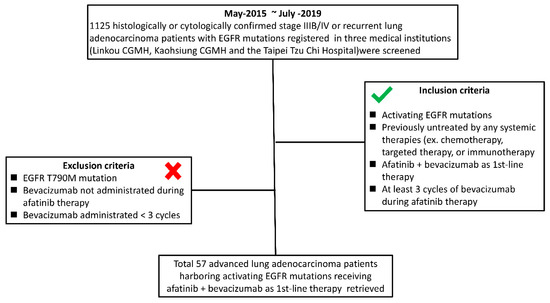 This multicenter cohort study was performed under the approval of the institutional review board (IRB) (Nos. 202000137B0 and 09-X-002), and personal informed consent was waived because the subjective data were reviewed retrospectively. Data on 1125 patients with histologically or cytologically diagnosed advanced (stage IIIB/IV and recurrent metastasis) NSCLC with EGFR mutations registered in 3 medical institutions (Linkou Chang Gung Memorial Hospital, Kaohsiung Chang Gung Memorial Hospital, and Taipei Tzu Chi Hospital) from May 2015 to July 2019 were screened. The inclusion criteria were as follows: (1) patients with activating EGFR mutations; (2) patients previously not treated with any systemic therapy, including chemotherapy, targeted therapy, or immunotherapy; (3) patients who received afatinib combined with bevacizumab as first-line therapy; (4) patients who received at least 3 cycles of bevacizumab during afatinib therapy. The exclusion criteria were as follows: (1) EGFR T790M mutation; (2) bevacizumab was not administered during afatinib therapy; (3) bevacizumab was administered for fewer than 3 cycles during afatinib therapy. The inclusion and exclusion criteria for retrieving patients are shown in Figure 2.