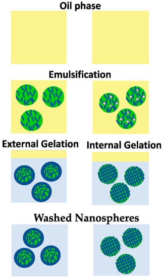 - Reis, C.P.; Neufeld, R.J.; Vilela, S.; Ribeiro, A.J.; Veiga, F. Review and Current Status of Emulsion/Dispersion Technology Using an Internal Gelation Process for the Design of Alginate Particles. J. Microencapsul. 2006, 23, 245–257. [Google Scholar] [CrossRef]