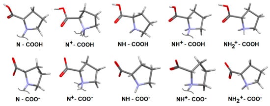 Neutral, zwitterionic, cationic and anionic forms of proline moieties as identified in 2366 relevant structures retrieved from the Cambridge Structure Database (CSD) ([]; CSD, ver. 5.41, May 2020).