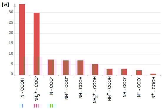 A further exploration of the CSD revealed various modifications in the proline skeleton and its derivatives, which leads to both a neutral form and different ionization states (either protonation, such as cation or anion, or zwitterionic forms) of proline-based tectonic subunits containing positively and negatively charged functional groups, in particular, proline moiety with –N and –COOH(–COO−) groups, –N+ and–COOH(-COO−), –NH and –COOH(-COO−), –NH+ and –COOH(–COO−), –NH2+ and –COOH(–COO−), see Figure 1 (and Table S1 in Supplementary Materials). An analysis showed that zwitterionic proline tecton with NH2+ and COO− groups is nearly as widespread as the neutral one. More specifically, ~34% of the entries with –N and COOH groups, ~30% of those with NH2+ and COO− functionalities, ~7% occurrence of hits with –N and COO−, –NH and COOH, and –NH+ and COO−, whereas all the remaining motifs are below 5% (Figure 2). The ionization state of proline moieties affected the supramolecular synthons involved.