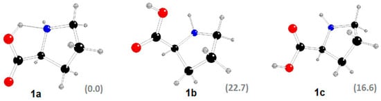Optimized geometry of L-proline, structure 1a, b and c with corresponding relative Gibbs free energies at 298 K (in kJ/mol) in parentheses (C—black, N—blue, O – red, H—grey).
