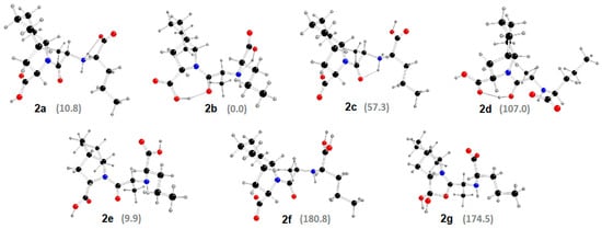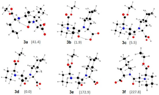 The X-ray structure of L-proline PROLIN03 1 has two hydrogen atoms located at the N1 atom (see Figure S1 for atom notation) due to two inter-molecular O…H-N hydrogen bonds []. During the geometry optimization of its single molecule in an aqueous solution, one N-bonded H atom is moved to the O1 atom with O1-H…N1 hydrogen bonding—structure 1a (Table S6, Figure 3). Other stable structures with the H atom bonded to O1 1b or O2 1c without any hydrogen bonding were found as well. N1 atomic charges are more negative than the oxygen ones, whereas the charge of hydrogen atoms bonded to N1 is less positive than that of the oxygen-bonded ones. Structure 1a is the most stable, in agreement with a similar study of Schmidt and Kass [].