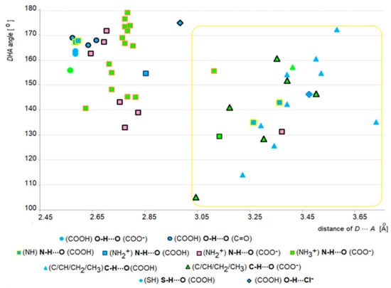 Diagram of the H-bond distance (Donor…Acceptor) and bond angle (Donor-Hydrogen…Acceptor) in proline and ACEI structures (19 structures; reference codes are included in the Table 1). In the perindopril-derived crystals, (OH_COOH)O-H…O(COO-), (NH2+)N-H…O(COO-) and (NH3+)N-H…O(COO-) and (C-)C-H…O(COOH) interactions are observed (colors of fulfilment are consistent with the three types of proline-based tectons observed in the crystals of proline and ACEI: blue-I, green-II, pink-III; weak interactions are marked by the yellow frame).