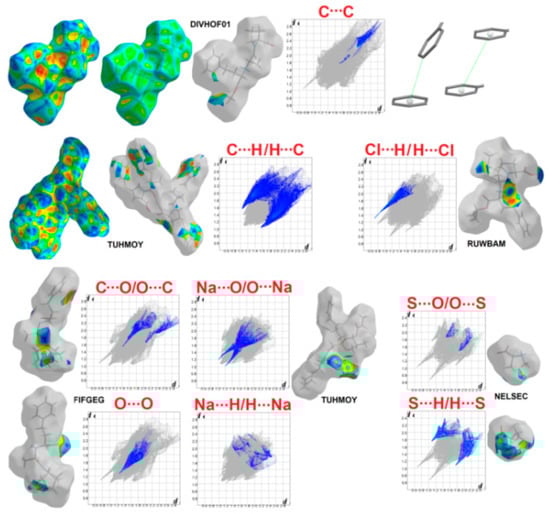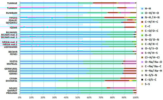The percentage contributions of major interactions are presented in Figure 9. The H…H, O…H/H…O and C…H/H…C inter-contacts are the major players, at the level over 78% (and 100% in GERWUX01). The highest share of H….H, O…H/H…O and C…H/H…C contacts is in BILNAN (78%), CIYNIH (39%) and DIVHOF01 (20%), respectively. S…H/H…S contacts are another significant factor, sharing total HS area at the level from 1.5% in BECWIR to ~10% in MCPRL01, TUHMUE, YOZTIS and RUWBAM. On the other hand, S…O/O…S contribute only in 1% in RUWBAM. Surprisingly, the C…C and N…H/H…N contacts are less visible and contribute to the overall crystal packing at 2% in DIVHOF01 and QOQWAU, respectively. C…O/O…C have relevance in DIVHOF01 and EDALEC (~1.5%) and in FIFGEG (4%). O…O wascfound in DIVHOF01 and RUWBAM (~2%) and in FIFGEG (5%). Cl…H/H…Cl and Na…O/O…Na are observed at the level of 5% in RUWBAM and TUHMOY, TUHMUE, respectively. In addition, Na…H/H…Na contacts exist (1.5%) in TUHMOY (Table S12).