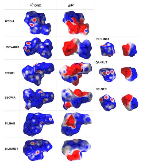 Electrostatic potential (EP) provides a further direct insight into the interactions in relation to the electrostatic complementarity between neighbouring moieties within the crystal. It proves the localisations of the main close inter-contacts mapped over the dnorm property. Notably, proline crystals have the nature of a dipole, with an H-bond donor (positive potential) and acceptor sites (negative potential), represented by blue and red areas, respectively. Perindopril structures and other analysed compounds containing COO− groups (associated with the negative EP) are of a rather similar nature. EP over the Hirshfeld surfaces of proline, perindopril derived structures and other proline-based ACEI crystals are shown in Figure 8 and Figure S11, respectively.