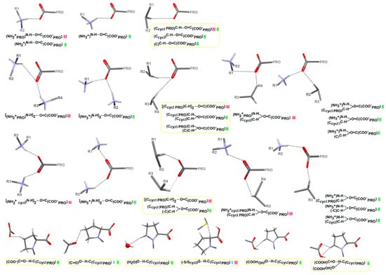 Supramolecular synthons resulting from three types of proline-based tectons observed in ACEI structures (three types of proline-tectons are color coded: I-blue, II-green, III-pink; synthons forming only by weak interactions are marked in yellow frames).