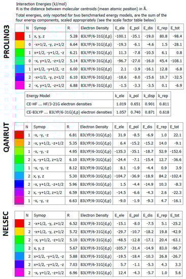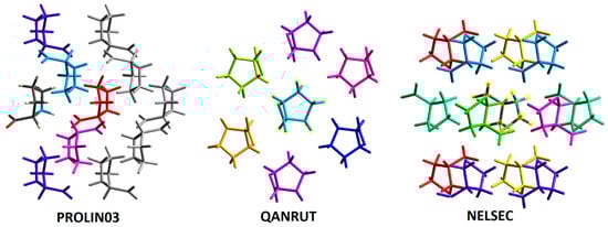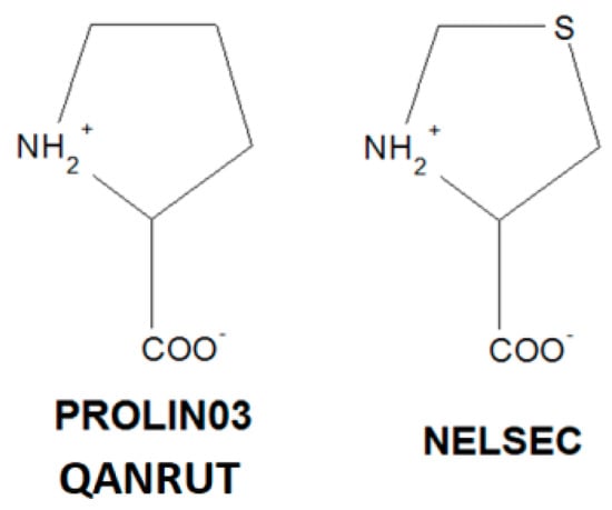 A survey of the Cambridge Structural Database (CSD, Version 5.41, last update May 2020) [] revealed 2366 proline-based structures, while in the Research Collaboratory for Structural Bioinformatics Protein Data Bank (RCSB PDB) [], 158 352 biomplexes containing proline moiety have beed deposited so far. An advanced search for proline crystal structures and its analogues in the CSD yielded L-proline (PROLIN03) [], D,L-proline (QANRUT) [], R-thioproline (NELSEC) [], L-thioproline (TAZOLC02, without H-atoms) []. In addition, several solvated forms of proline were found: D,L-proline monohydrate (DLPROM02) [], L-proline monohydrate (RUWGEV) [], D,L-proline chloroform solvate (WERMIQ) []. Besides, 4-hydroxy-L-proline (HOPROL12) [], 4-hydroxy-R-proline (UPIKUB) [] can be mentioned. Notably, all of them represent the zwitterionic form, with NH2+ and COO− functionalities. For the sake of simplicity, only the unsubstituted structures of proline, i.e., PROLIN03, QANRUT and NELSEC, were subjected to supramolecular analysis as presented in the next section, see Scheme 1.