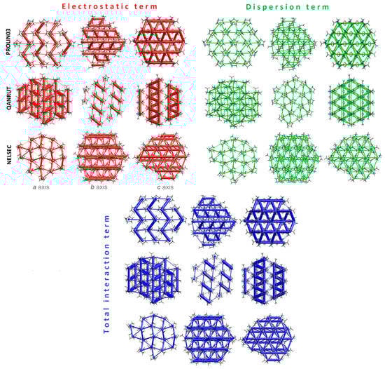 The lengths and angles of H-bonds in intermolecular interactions resulting from the three types of proline-based tectons have been compared (Figure 6). In particular, related geometrical parameters in O-H…O, N-H…O and C-H…O are observed in the range of: 2.58–2.67 Ǻ and 156–169°, 2.59–3.38 Ǻ and 129.4–179.1°, 3.05–3.59 Ǻ and 114–172.4°, respectively. More specifically, these interactions were divided in terms of functional groups. In particular, in the case of O-H…O: COOH….COO− and COOH…C=O, for N-H…O: NH…COOH, NH2+…COOH, NH2+…COO− and NH3+…COO−, for C-H…O: COOH…C(CH/CH2/CH3) and C(CH/CH2/CH3)…COO−. Among these three subtypes, the following order is observed: COOHO-H…OCOO- (2.57–2.59 Ǻ and 156–164°) < COOHO-H…OC=O (2.58–2.67 Ǻ and 166–169°) < NHN-H…OCOOH (2.59–3.37 Ǻ and 135–167.8°) < NH2+ N-H…OCOO- (2,65–3,38 Ǻ and 129.4–171.8°) {NH3+N-H…OCOO- (2.63–3.12 Ǻ and 140.7–179.1°) < C/CH/CH2/CH3C-H…OCOO- (3.05–3.51 Ǻ and 128.4–160.7°) < COOHC-H…OC/CH/CH2/CH3 (3.23–3.59 Ǻ and 114–172.4°. Additionally, O-H…Cl− (2.99 Ǻ and 175°) and S-H…O (3.51 Ǻ and 146.2°) interactions are observed. According to Figure 6, we can elegantly differentiate between strong and weak interactions participating in the formation of supramolecular synthons.