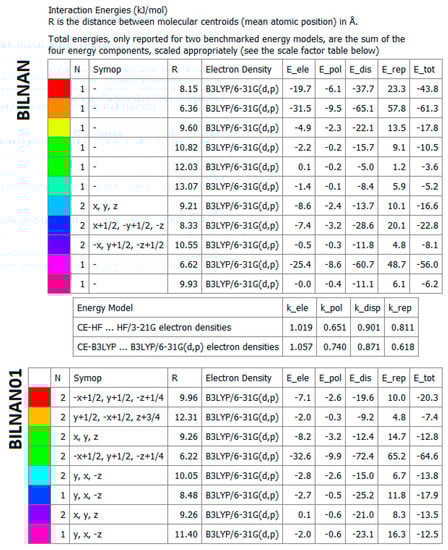 The enrichment ratios (ER) of the interactions available in the analysed crystal structures were based on the HS methodology, see Section 3.2. []. Results of calculations are collected in Table 2, Table 3 and Table 4 and Table S14. Privileged contacts in relation to the ER are as follows: