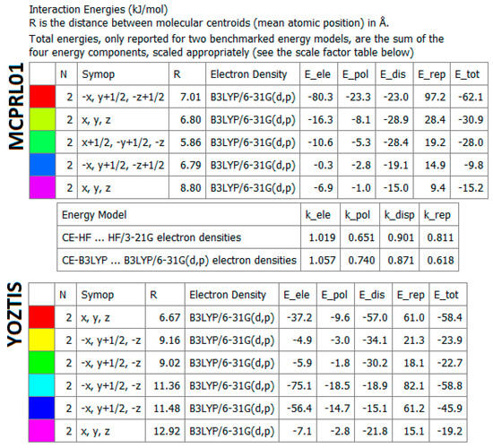 - Mackenzie, M.F.; Spackman, P.R.; Jayatilaka, D.; Spackman, M.A. CrystalExplorer Model Energies, Energy Frameworks, Extension to metal coordination compounds, organic salts, solvates and open-shell systems. IUCr J. 2017, 4, 575–587. [Google Scholar] [CrossRef]