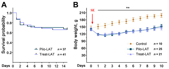 Survival and body weight were monitored for 2 weeks after SE. The first week after SE, rats were administered a 5% glucose solution (2 mL, subcutaneous) daily to improve survival [58].