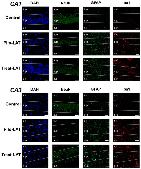 For the quantitative analysis, we performed an immunofluorescent assay using neuronal marker NeuN, astrocyte marker GFAP, and microglia cell marker Iba1. The number of NeuN-positive neurons was significantly decreased in the CA1 and CA3 areas following SE. Consistent with previous reports [23], the average number of GFAP-positive astrocytes was almost three times higher in the Pilo-LAT group than in the control group. The number of Iba1-positive microglial cells in the CA1 and CA3 of the Pilo-LAT group was about four times higher than in the control group (Figure 4 and Figure 5).