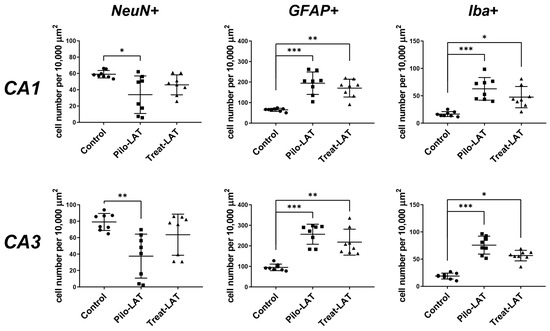 Effects of anakinra treatment on neuronal loss and gliosis. Diagrams show the number of NeuN-positive neurons, GFAP-positive astrocytes, and Iba-positive microglial cells in the CA1 and CA3 areas of the hippocampus. Each dot represents results from one animal; horizontal lines show the means and standard deviations. Group comparisons were made with the Kruskal–Wallis test and followed with Dunn’s post hoc tests. NeuN-positive cells: CA1 (F(2,23) = 7.8, p = 0.02), CA3 (F(2,23) = 9.8, p < 0.01), GFAP-positive astrocytes: CA1 (F(2,23) = 15.7, p < 0.001), CA3 (F(2,23) = 16.1, p < 0.001), Iba-positive microglial cells: CA1 (F(2,23) = 16.1, p < 0.001), CA3 (F(2,23) = 17.6, p < 0.001). Pilo-LAT: rats administered with pilocarpine; Treat-LAT: rats administered with pilocarpine and then treated with anakinra. * p < 0.05; ** p < 0.01; *** p < 0.001.