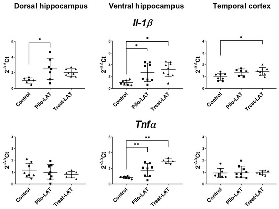 The relative expression of proinflammatory cytokine genes (Il1b and Tnfα) in the dorsal hippocampus (DH), ventral hippocampus (VH), and temporal cortex (TC) of rats 7 days after pilocarpine-induced SE without (Pilo-LAT) and with (Treat-LAT) anakinra treatment. Each dot represents one animal; horizontal lines show the means and standard deviations. * p < 0.05; ** p < 0.01 in ANOVA with Tukey’s post hoc test. Il1b: DH: F(2,18) = 5, p = 0.02; VH: F(2,21) = 7.1, p = 0.004; TC: F(2,19) = 5, p = 0.02. Tnfa: VH: F(2,18) = 23.5, p < 0.001.