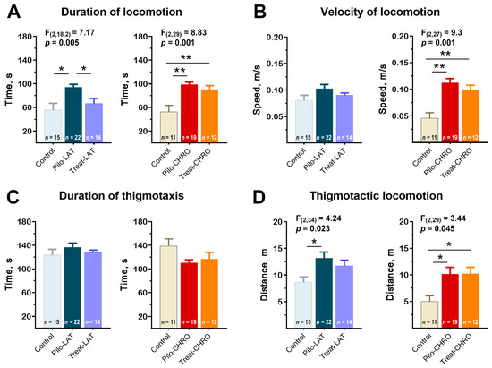 Effects of anakinra treatment on locomotor activity in the open-field arena. One-way ANOVA with Tukey’s post hoc test was used for statistical analysis. Significant differences between groups are shown in the diagrams. (A) Duration of locomotion in the open-field test (OFT). (B) The average speed of locomotion. (C) The average time of locomotion in the thigmotactic area. (D) Distance traveled in the thigmotactic area. Pilo-LAT and Pilo-CHRO: rats with pilocarpine-induced SE studied during the latent phase and chronic phase of the model accordingly; Treat-LAT and Treat-CHRO: post-SE rats treated with anakinra and studied during the latent phase and chronic phase of the model. * p < 0.05, ** p < 0.01.