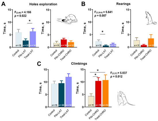 Effects of anakinra treatment on characteristics of exploratory activity in post-SE rats. One-way ANOVA with Tukey’s post hoc test was used for statistical analysis. Significant differences between groups are shown in the diagrams. Diagrams show the average time spent (A) exploring holes, (B) rearing, and (C) climbing for the different groups of rats. Pilo-LAT and Pilo-CHRO: rats with pilocarpine-induced SE studied during the latent phase and chronic phase of the model accordingly; Treat-LAT and Treat-CHRO: post-SE rats treated with anakinra and studied during the latent phase and chronic phase of the model. * p < 0.05, Tukey’s post hoc test.