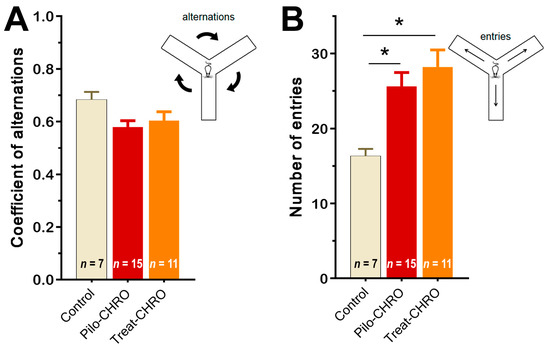 Anakinra treatment did not change the behavior of post-SE rats in the Y maze. One-way ANOVA with Tukey’s post hoc test was used for statistical analysis. Diagrams show the average coefficient of (A) alternations and (B) the number of visited arms in the Y maze in different groups of rats. Pilo-CHRO: rats with pilocarpine-induced SE studied during the chronic phase of the model accordingly; Treat-CHRO: post-SE rats treated with anakinra. * p < 0.05 in ANOVA Tukey’s post hoc test.